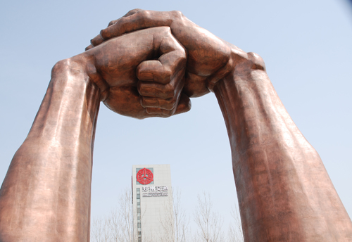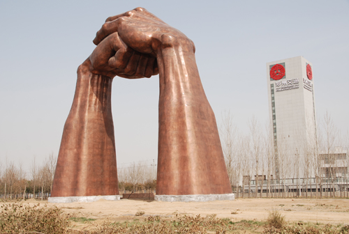 《礼仪之门》安装地点:西四环连霍高速沟赵收费站对面  雕塑30米,材质:锻铜。“抱拳礼”是中华传统礼仪风范的一种礼貌动作,含有尊重、欢迎的寓意。以“抱拳礼”为原型的30米高雕塑《礼仪之门》有望成为郑州新地标。